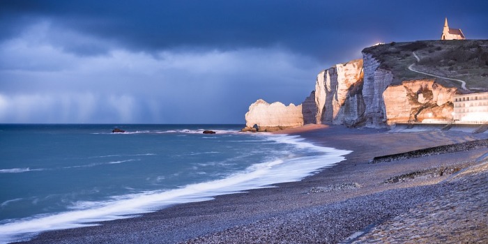 Etretat is a town situated on the North coast of France, popular for its impressive rock formations and white cliffs, picturesque views, the old chapel and the dramatic views of the old town.